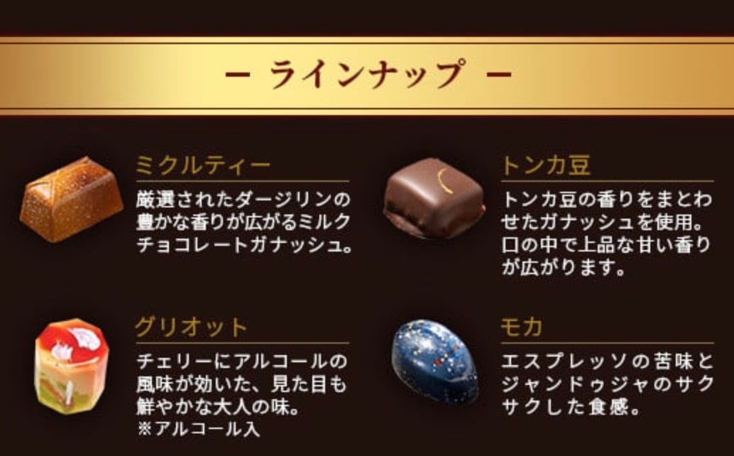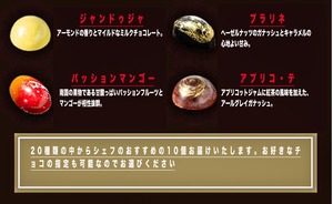 ※20種類の中からシェフのおすすめの10個お届けいたします。お好きなチョコの指定も可能なのでお選びください